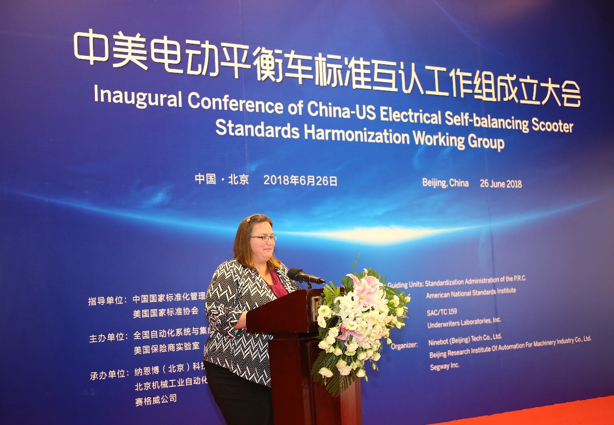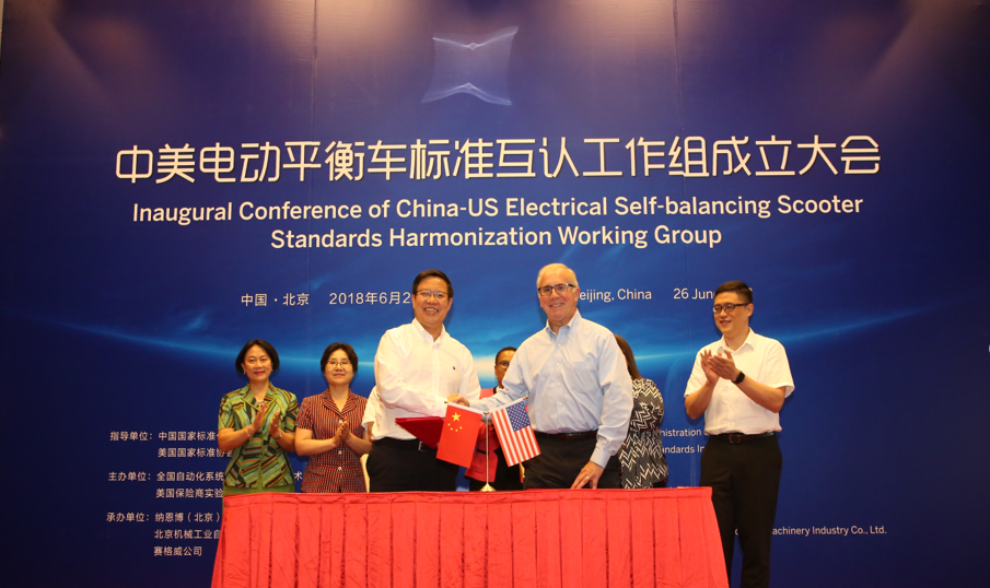 6月26日,中美电动平衡车标准互认工作组成立大会在北京唯实大厦成功举行。全国自动化系统与集成标准化技术委员会主任委员、机械总院集团董事长王德成与美国保险商实验室全球副总裁 Philip M.Piqueira分别代表中美双方签署电动平衡车标准互认合作协议。中国国家标准化管理委员会副主任殷明汉、IEC美国国家委员会副主席Sonya Bird、美国大使馆参赞Cynthia Griffin、北京航空航天大学教授王田苗、全国自动化系统与集成标准化技术委员会秘书长黎晓东、Segway-Ninebot公司总裁王野等领导及电动平衡车国家标准起草组专家出席会议,共同见证了中美两国标准化合作的历史时刻。