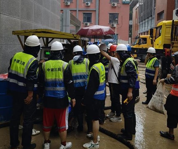7月21日,暴雨导致河南省郑州大学第一附属医院积水漫延至一楼大厅,水深处达一米。中建三局闻汛而动,中建三局总承包公司中原分公司组织100余人的应急抢险团队,乘坐4辆卡车,携带16台水泵、800米水袋、1300余个沙袋、300余件雨衣、300余双雨鞋,奔赴郑州大学附属第一人民医院开展抢险救援,帮助医院排水、清理设备、转运病患。截至21日12时,前两台水泵已经开始抽水,正协调大功率发电机支援医院,助力医院最快恢复正常运转。中建郑州双湖科技城朱砦项目紧急参与抢险,出动铲车在郑州莲花街救助四批被困群众。